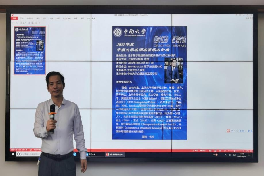 名师名家学术论坛报告在铁道校区交通楼425顺利举办。本次报告邀请到上海大学管理学院院长镇璐教授担任主讲人,其报告题目为:基于数学规划的新型配送模式决策优化研究。镇璐教授在港口航运物流系统、多式联运、物流配送优化理论与方法等方面学术造诣高、研究成果丰富。