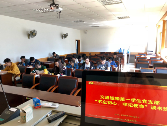 为贯彻学习习近平新时代中国特色社会主义思想积极响应全党开展不忘初心、牢记使命主题教育的号召,1020上午10点,交通运输第一学生党支部于交通楼425室召开“立德树人担使命”主题学习研讨交流会,并在会后开展了为期一小时的支部首次主题教育学习读书班活动。支部全体成员出席本次会议,支部书记石晓琪主持会议。