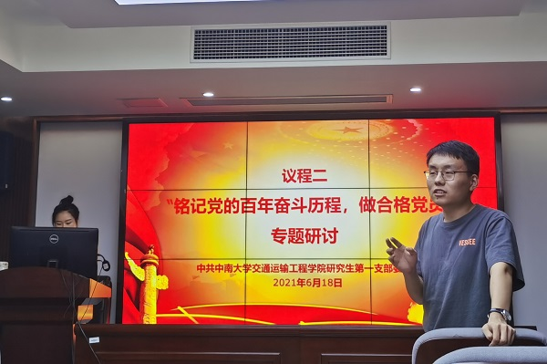 6月18日,交通院研究生第一党支部在交通楼425教室举行了“铭记党的百年奋斗历程,做合格党员”专题研讨大会。会议由支部书记黄裕同志主持,支部全体党员和积极分子出席本次会议。