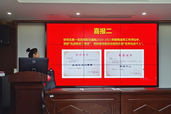 会议伊始,党支部书记黄裕同志向大家宣布了研究生第一党支部近期所获的成就,包括在交通院"歌声里的中国共产党”合唱比赛中荣获二等奖,在交通院2019-2021年度“七一”表彰的评选中荣获"2019-2021年度"先进党支部",在交通院2020-2021年新闻宣传工作评比中荣获"先进集体二等奖”,同时宣传委员肖杨同志获"优秀先进个人"等。