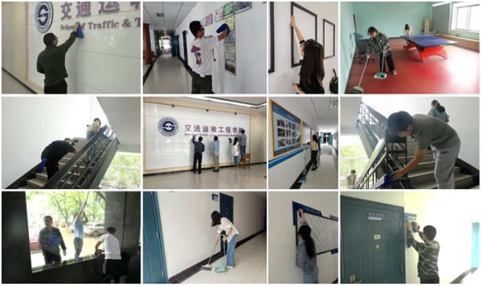 在联合支委会提前统筹策划下,本次交通楼大扫除活动设置有一楼大厅组、二至五楼工作组、楼道组以及机动组,工作内容包含外墙玻璃、宣传栏、展示长廊、扶手及乒乓球室等地的卫生。在这场师生联手的大扫除活动中,同志们组织严明、分工明确,十分高效地完成了工作。