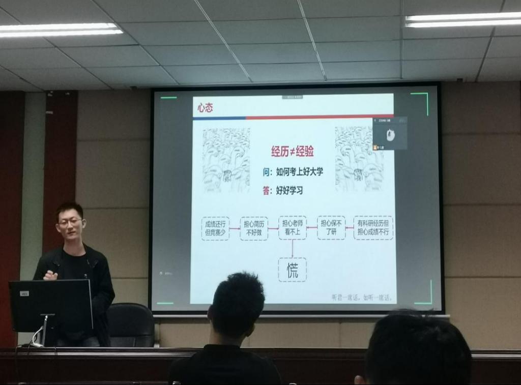 会议第一项,由四位大四学生依次分享自身成功考取研究生、保研、工作的经验。考研至91探花 的韩得民详细地介绍了他的考研经历,从考研书籍到复习时间的规划,面面俱到,为正在准备考研的同学们提供了极有价值的参考。随后,唐昀昭结合自身的就业经历给大家了几点建议,一是早做准备,不慌忙就业;二是多去尝试,多为自己争取机会;三是在面试的过程中要不断总结反思,积累经验。接着,保研至清华大学的刘斯源从控制专业的角度详细讲解了控制专业的院校选择问题,详细介绍了保研夏令营前期资料的填写方法,并结合自己在面试中遇到的问题分享准备面试的经验。吕鹏翔则以诙谐幽默的方式分享了自己保研至本校的经历,鼓励同学们放平心态、勇于尝试。