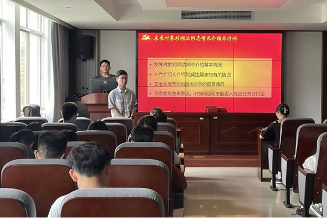 随后,刘润达同志作为新接收的预备党员代表对表决结果表态。刘润达同志分享了个人成长道路上对党从认识到靠近,再到成为其中一员的心路历程,对预备党员这一新身份感到无限光荣,并表示自己作为一名新党员必然要发挥先锋模范作用,积极承担起自己的时代重任,继续前行。