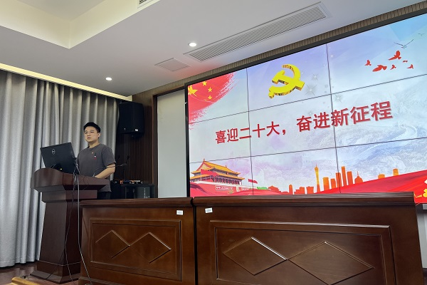 专题视频观看完毕后,研五支部书记冯推银同志主持开展专题教育活动。他首先对二十大召开的时间地点等基本信息进行了介绍,并对二十大召开的伟大意义进行了详细解读,着重解读了人大代表的结构组成及选举流程,使与会同志对人大代表的桥梁纽带作用有了更深刻的理解与体会。