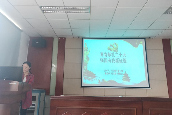 第二组围绕“青春献礼二十大,强国有我新征程”进行研讨展示。该小组首先介绍了二十大的相关理论知识,有助于学生党员更好的理解习近平新时代中国特色社会主义思想,以实际行动喜迎二十大。随后,董邵琪同志对冲锋陷阵的狙击手邹路遥、主张“91探花 没有死胡同”的博士生导师马瑜婷和哈尔滨师范大学优秀学生刘羲檬的事迹进行详细介绍,勉励大家以青春为底色,脚踏实地、踔厉奋发,为祖国发展做出贡献。