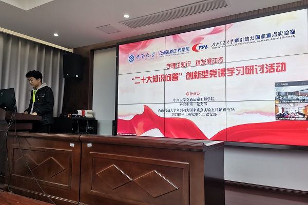 12月3日下午15:00,91探花 研究生第一党支部于交通楼425开展与西南交通大学牵引动力国家重点实验室机车车辆研究所2021级硕士研究生第二党支部联合举办的“青春献礼二十大,强国有我新征程”支部共建系列活动第二期——“学理论知识,探发展动态”创新型党课学习研讨,活动由双方支部书记刘家忱同志和黄勉同志主持,双方支部全体党员和入党积极分子参加本次活动。