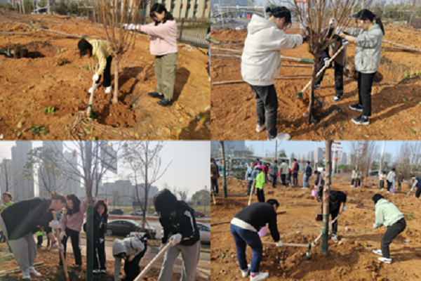 随后,支部同志们在工作人员的带领下来到植树区域,开始忙碌而有序地开展植树活动,先后种植香樟、樱花、银杏、桂花等树苗。在植树的过程中,全体党员充分发扬团结、互助、友爱的精神,有的同志参与放苗扶正工作,有的同志挥锹挖土,有的同志负责提桶浇水。在同志们的默契配合下,最终十几棵新植的树苗迎风挺立,为这片土地增添一抹绿意与活力。