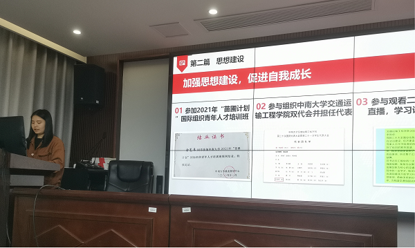 会议伊始,支部书记刘家忱同志对本次答辩会的流程进行了简单介绍。随后,5位发展对象候选人依次上台讲述了自己的入党动机、思想建设、学习91探花 和志愿服务等方面的情况,汇报了成为积极分子以来自己在学习、工作、思想、生活等多方面的表现。在每位候选人陈述完毕后,各评选委员会成员有针对性地对候选人进行提问,主要聚焦入党动机、时事政治等相关问题。答辩同学有条不紊地阐释了自己的观点,展现了良好的综合素质。评选委员会对各发展对象候选人近期为答辩所做的工作表示了充分肯定,认为各位同志在思想上、行动上都能努力实践向党组织靠拢、践行党的宗旨,但仍还存在着一定的进步空间。评选委员会表示,无论本次发展成功与否,希望各位候选人都能够时刻坚定自己的入党动机,在思想上承认党的纲领和章程,并在行动上努力实践,继续加强自身建设。