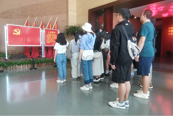 到达参观地后,同志们统一前往中国共产党长沙历史陈列馆和中共湘区委员会旧址暨毛泽东杨开慧故居进行参观学习,在研一支部书记刘家忱的带领下,同志们面向党旗重温入党誓词,回顾自己的入党初心并合影留念。