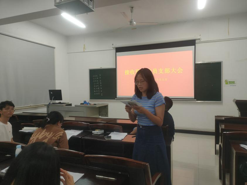 经过集体讨论和无记名投票,大会通过并同意接收刘佳怡、谷之璐、章欣妮、王玉婷、朱柳燕、徐淑婧、姚若冰和陈镜茹八位同志为预备党员。新同志们依次上台发表感言,她们表示将改正自己的不足,主动投身支部工作,积极发挥党员的先锋模范作用。