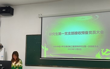 12月8日晚19:00,研究生第一党支部在交通楼509举行接收预备党员大会,讨论接收新一批发展对象为预备党员。会议由支部书记马珊同志主持,支部全体党员及发展对象参加本次会议。