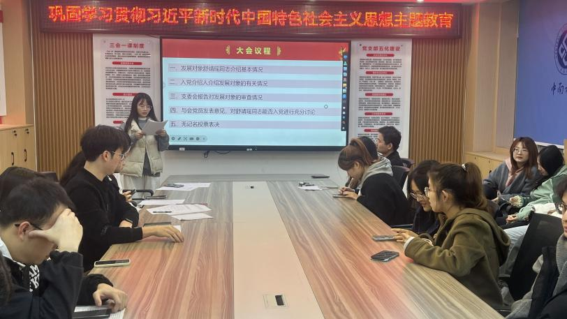 最后,经过大会的讨论,支部书记宣读表决决议,党支部同意接收彭哲同志、谢姝洁同志、舒靖瑶同志为中共预备党员。支部书记陈灏同志对三位新党员的加入表示了热烈欢迎和衷心祝贺,并勉励他们继续加强学习,不断提高政治素质和业务能力,以实际行动践行党的宗旨和誓言。