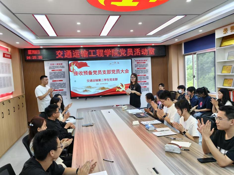 6月8日,交通运输第二学生党支部于党建活动室开展预备党员接收大会,本次活动由蒋昊轩同志主持,全体党员参与。