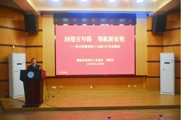 以国际报告厅为主会场举行“党的十九届六中全会精神”专题宣讲会,另外设置6个分会场,采用腾讯会议直播的形式组织全体党员参与学习。本次宣讲会邀请湖南省委教育工委党校常务副校长、省高校干部培训中心主任、书记刘国华教授担任主讲,学院党委书记贺志军老师主持。