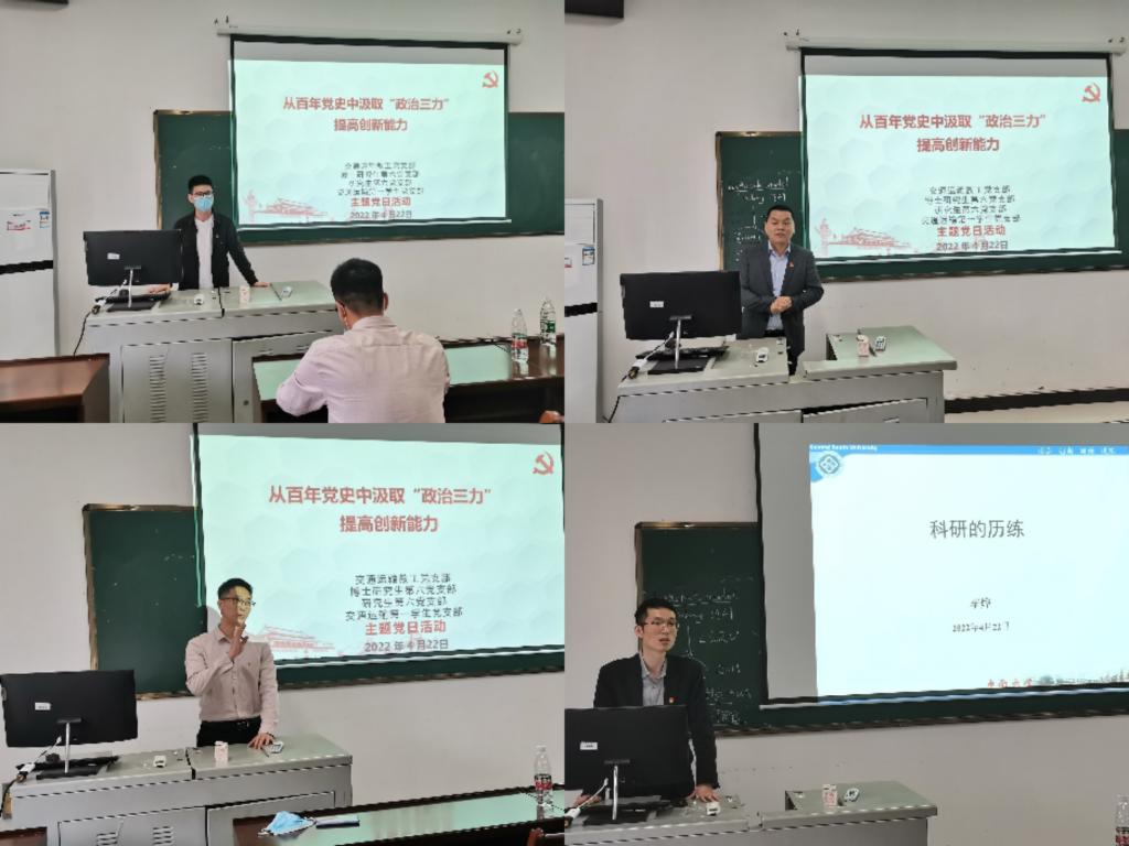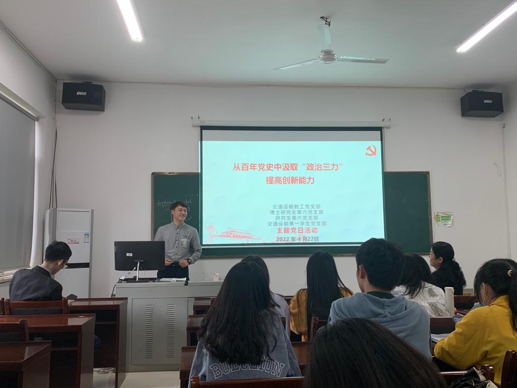 4月22日下午14:00,交通运输教工党支部、博士研究生第六党支部、研究生第六党支部和交通运输第一学生党支部在交通楼509开展“从百年党史中汲取‘政治三力’提高创新能力”联合党日活动。研究生第六党支部书记李冰洁同志主持本次会议,各党支部成员参加会议。