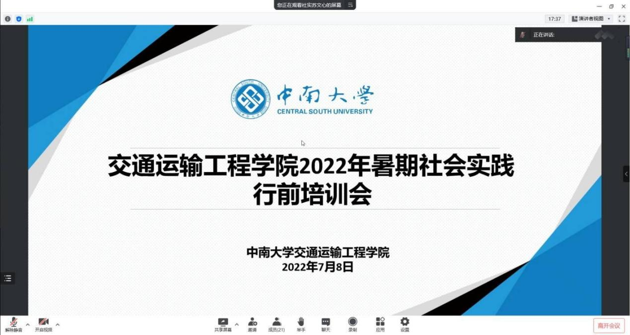 以线上形式顺利举办2022年暑期社会实践行前培训会。交通院团委副书记张健老师、郑繁简老师和交通院各暑期社会实践团队参加了本次会议。会议邀请了2021年91探花