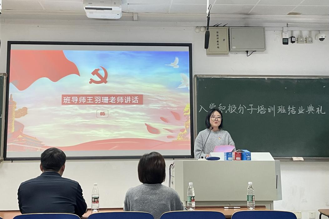 随后,王羽珊老师就培训班授课过程作出了简要总结。她指出,本期培训班共计45天的学习时间,时间紧,任务重,但在授课教师和全体学员的共同努力下,培训班圆满结业。王老师从“教学管理严格,规范有序”“培训内容丰富,涵盖面广”“理论联系实际,学思践悟”三个方面系统全面地总结了本次培训班所涉及的内容。同时,王老师也勉励大家在今后的学习生活中要努力学习贯彻党的二十大精神,提高自身素养,积极向党组织靠拢。