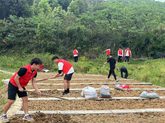紧接着,同学们分为三组开展劳动活动。第一组为除草翻地组,六名志愿者挥舞着锄头和镰刀,把结块的土壤翻新,把路边的杂草铲除,担任着最苦最累的工作,但他们依然干得热火朝天,兴趣盎然。