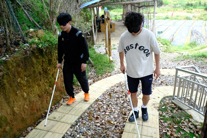 活动伊始,在上善助残服务中心谷老师的带领下,同学们分成两队,蒙上眼罩,依托拐杖沿着盲道行走,切身体验到了以盲人为代表的残障人士在生活中的不便。面对困难,残障人士们依然没有放弃对生活的热爱,通过自身的劳动创造着美好明天。这使得志愿者们了解了残障人士的世界,更加珍惜来之不易的健康生活。
