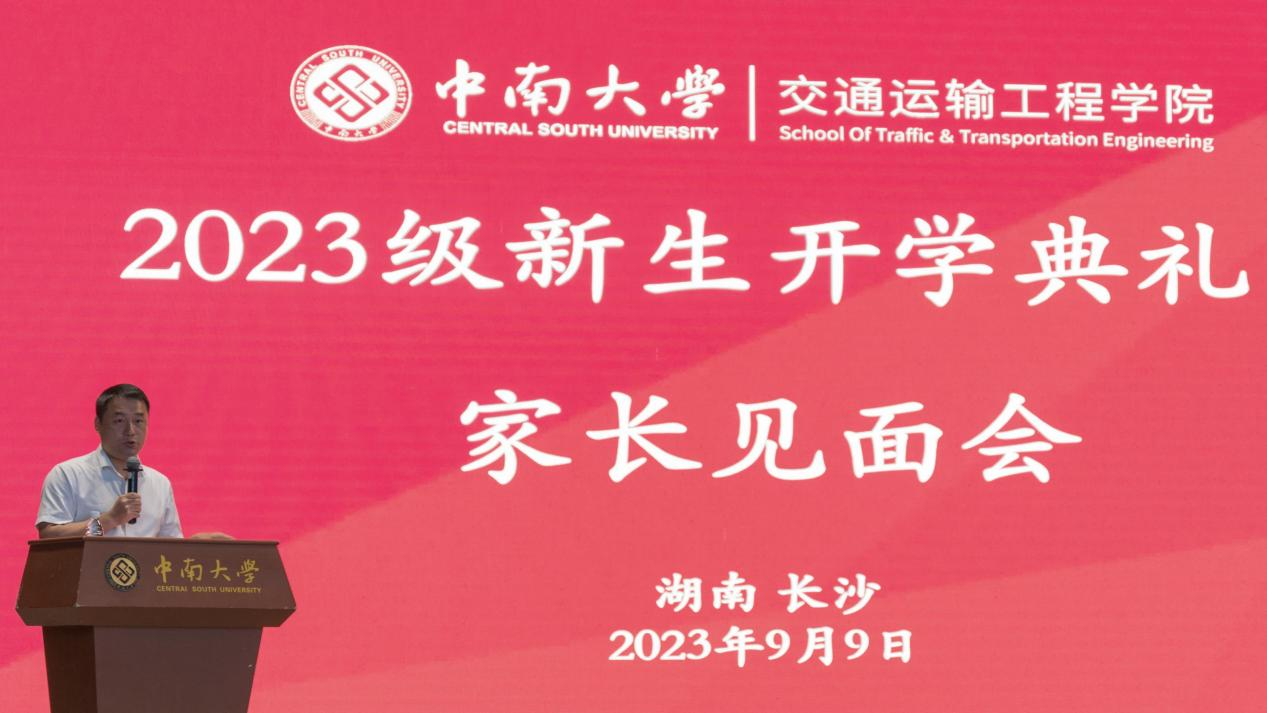 于南校区大礼堂顺利举行2023级新生开学典礼暨家长见面会。学院党委书记贺志军,院长高广军,党委副书记宋晓东,副院长张英贵、陈维亚、韩锟、刘辉,高速中心支部书记鲁寨军,教授委员会主席姚松,运输系党支部书记叶峻青,设备系副主任李蔚出席会议。与会人员还有23级新生班导师代表,学工办主任樊佳俊,学工办副主任张佳琪,团委书记张健,各年级辅导员,以及2023级全体新生、家长代表。会议由宋晓东副书记主持。