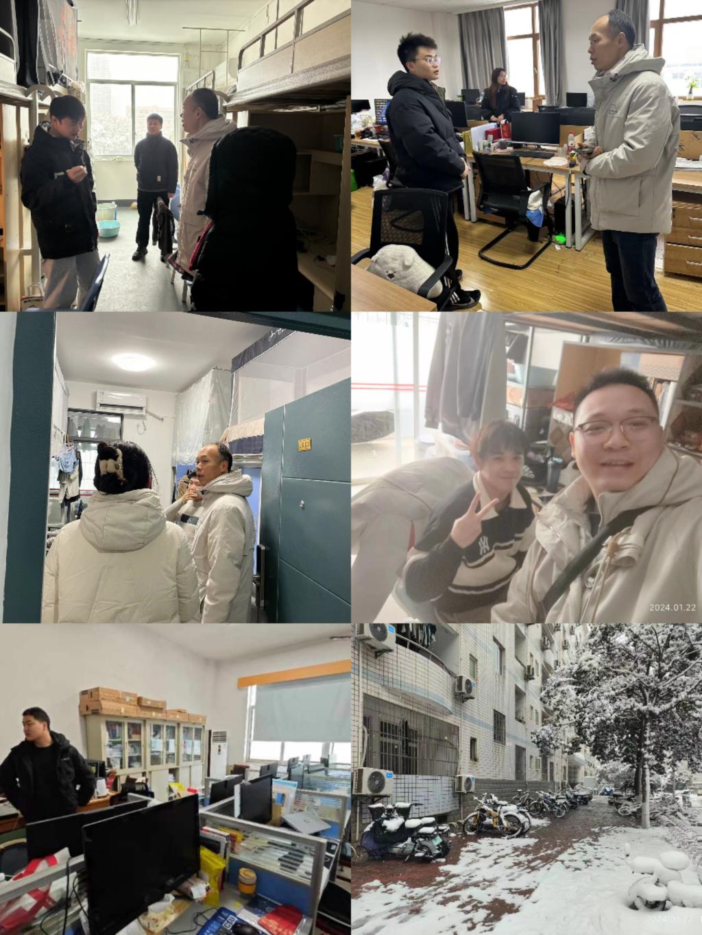 22日上午,学院党委副书记李苑、各年级辅导员深入研究生实验室、学生寝室以及学生宿舍楼周边,切实开展安全风险隐患集中排查,做好雨雪冰冻等极端天气下的出行安全教育。