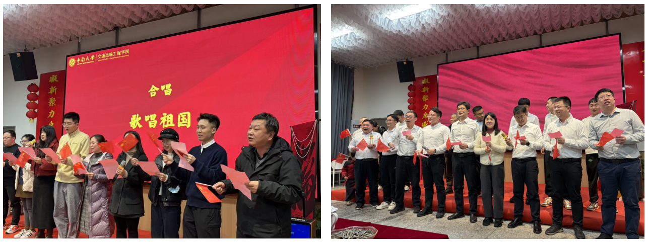 开场舞《“E”点“新”意》以唐风雅韵融合现代节奏,瞬间点燃现场气氛。随后,各系所教师纷纷登台献艺:交通设备与控制工程系与实验教学中心带来的合唱《我和我的祖国》深情款款,表达了教师们对祖国的赤子情怀;物流工程系演唱的《中国人民解放军进行曲》铿锵有力,展现了团结奋进的精神风貌;学工办创作的《健康到到令》以生动形式演绎工作与健康的平衡智慧;高速列车研究中心教师合唱的《爽爽的中南》搭配自创MV,尽显青春活力;交通运输系创作的舞台剧《运输人的时光诗》通过情景叙事,娓娓道来交通人的初心与担当;交通信息与控制工程系压轴献唱的《歌唱祖国》将晚会推向高潮,激昂歌声引发全场共鸣。