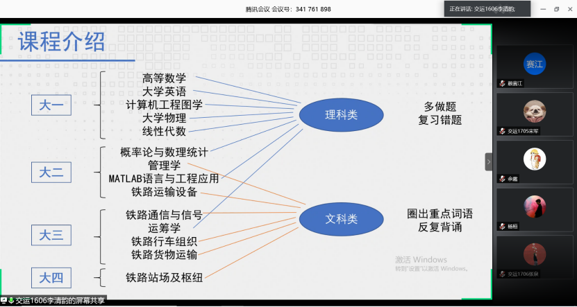 接着,交通运输16级专业前十名且成功保研东南大学的李清韵学姐分享了自己“早定目标,早做准备”、“明确目标,勇于奋斗”的学习经验,并介绍了交通运输专业的本科课程体系以及在小组作业、课设和实习等方面的具体学习技巧。其中,她将专业课程分为理科和文科两类,针对不同性质的课程提出不同的学习方法,比如,理科类课程应采用多做习题复习错题的方法,而文科类的课程则应使用圈出重点词语反复背诵的策略。