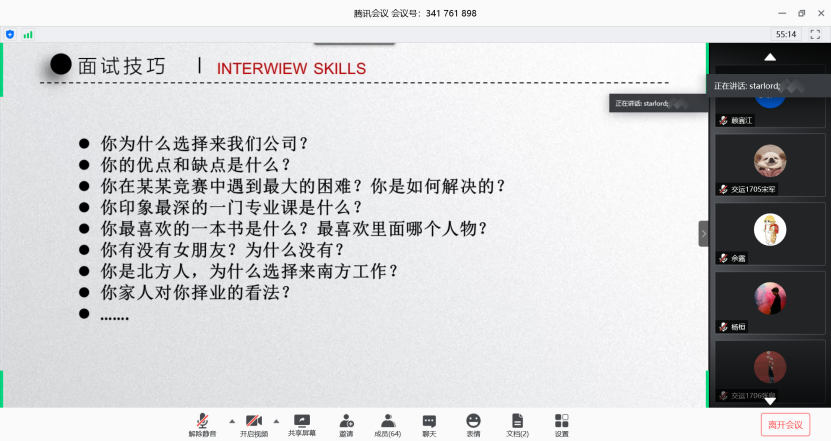 之后,即将就职于武汉地铁公司的颜靖洲学长从简历制作、面试技巧、时间规划、实习信息和就业方向等五个方面分享了自己的就业经验。他表示在选择职业时要充分了解就业市场信息,正确看待当前的就业形势,综合权衡利弊并提前做好充分准备,从而选择最适合自己的职业。在经验分享结束后,颜靖洲学长还一次性为十余位学弟学妹解答了关于地铁公司和铁路局的薪资待遇、工作制度和工作挑战等就业方面的问题。