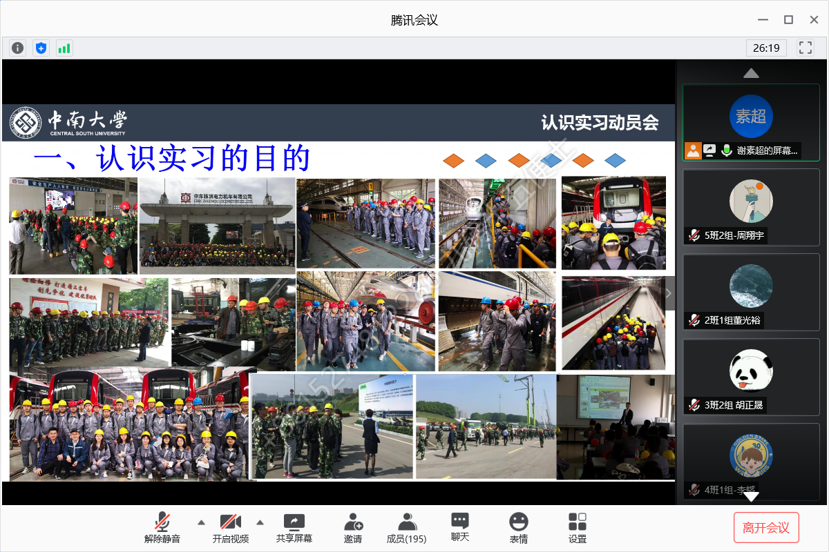 会议开始,谢素超老师先向同学们介绍了各班带队老师,紧接着谢素超老师介绍认识实习的目的、纪律要求排以及成绩评定标准等各项相关事务,让同学们充分认识到认识实习的重要性。接下来谢素超老师介绍了本次认识实习带队老师与同学分组情况,以及实习时间安排与实习相关要求。谢素超老师强调了虽然本次实习在线上举行,但是大家依旧要认真对待,按时完成实习报告,谢素超老师最后强调了线上实习的组织纪律问题等。