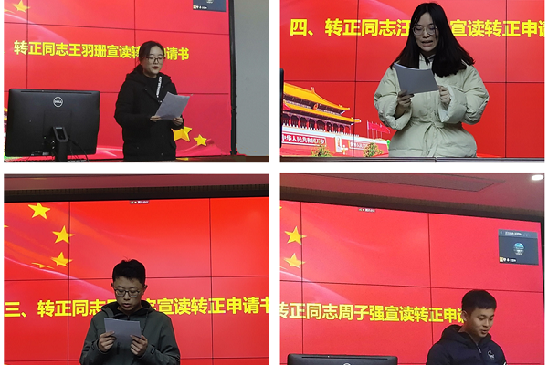 首先,郭秉筠同志简要介绍了本次会议的流程。王羽珊、周子强、周翔宇、汪卓聪4名同志汇报预备期间的思想、学习和工作情况,以及在预备期间所取得的成就;随后支部黄晴同志作为入党介绍人代表介绍了4名同志在预备期间的教育考察意见,并提出具有针对性的批评和建议,希望名同志在认识到自身不足后能及时改正,戒骄戒躁,在各个方面不断完善、不断进步;由苏孟帅同志并代表支部委员会报告四位同志在预备期间的教育考察情况;随后,与会党员对4名同志能否按期转正逐一进行了讨论、发言;经大会全体正式党员无记名投票表决,一致同意四名预备党员转为中共正式党员。