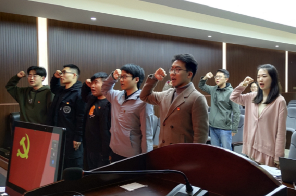 紧接着进行预备党员接收大会。会上,丁一、彭泽胄、郭冬阳、邓涵文、裴晓晖等5位发展对象就本人的基本情况,入党动机,对党的认识等向大会进行了详细的汇报。黄晴同志、苏孟帅同志作为入党介绍人就5位发展对象有关情况及培养过程中的表现向支部大会做了介绍;周翔宇同志与孙光与同志宣读5未发展对象的群众调查意见与政审意见,王羽珊同志宣读支部对5位发展对象的考察意见;最后与会的全体党员本着认真负责的态度对发展对象能否入党进行充分讨论,经大会全体正式党员无记名投票表决,最终同意接收丁一5名发展对象为中共预备党员。随后会议进行了庄严且隆重的宣誓仪式。