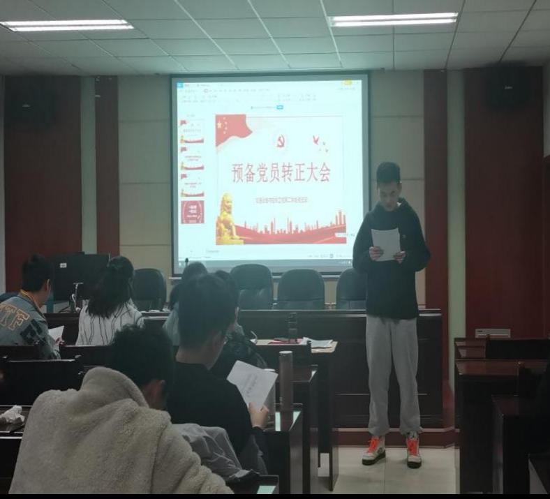 会议伊始,马赛同志介绍了此次会议的基本流程及相关要求。紧接着,三位预备党员依次宣读«转正申请书»并介绍自己在预备党员期间的基本情况。曾浩洋同志扎实开展学生工作,作为班委能够深入群众、服务群众。李致远同志积极参与志愿服务工作,将服务他人的精神落实在实践当中;孙金库同志在学习、竞赛方面表现优异,起到了良好的模范带头作用。
