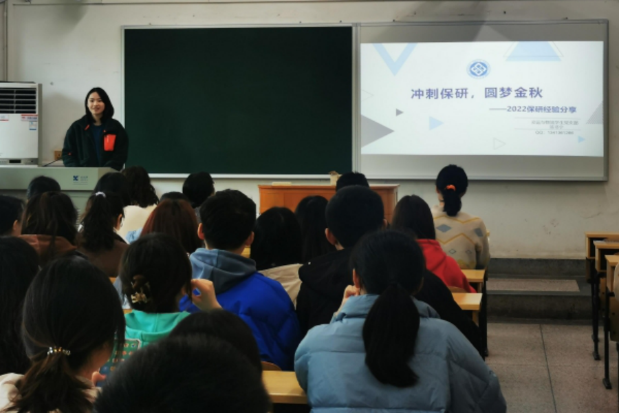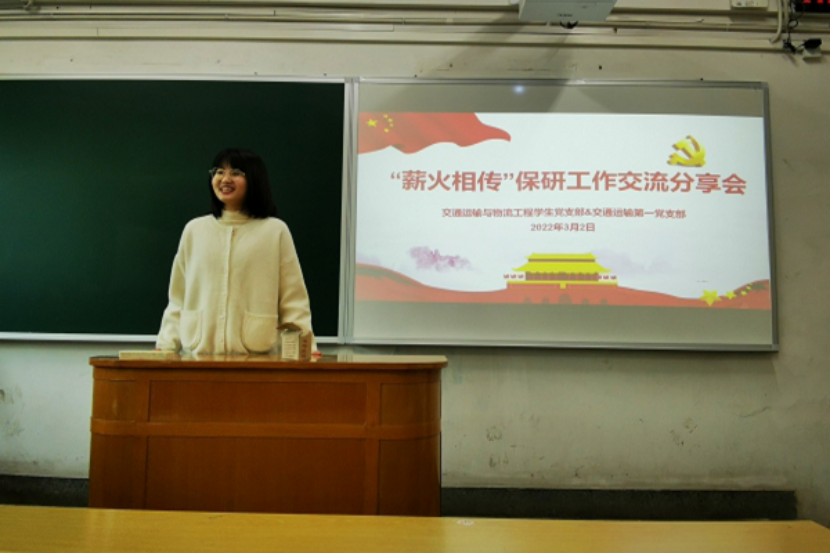 交通运输与物流工程学生党支部联合交通运输第一学生党支部在世纪楼B202开展“薪火相传”交流分享会之保研与工作专场。本次交流会邀请了汤书宁、蒋欣珏、曹腾、曾凡铭、游弋、杨杰6位18级的同学进行经验分享,近百名交通院的同学参与了本次分享会,会议由支部成员肖奕忆同志主持。