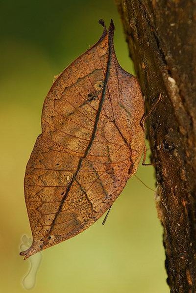 它原本是和其他蝴蝶一样,拥有美丽的翅膀,飞舞于丛林之间,本应光彩夺目。可它为了躲避捕杀,褪去了它鲜色的翅膀,隐去了斑斓的彩色,挂上了枯叶的伪装,留下的只是一片枯槁的,憔悴的,令人伤心的落叶。