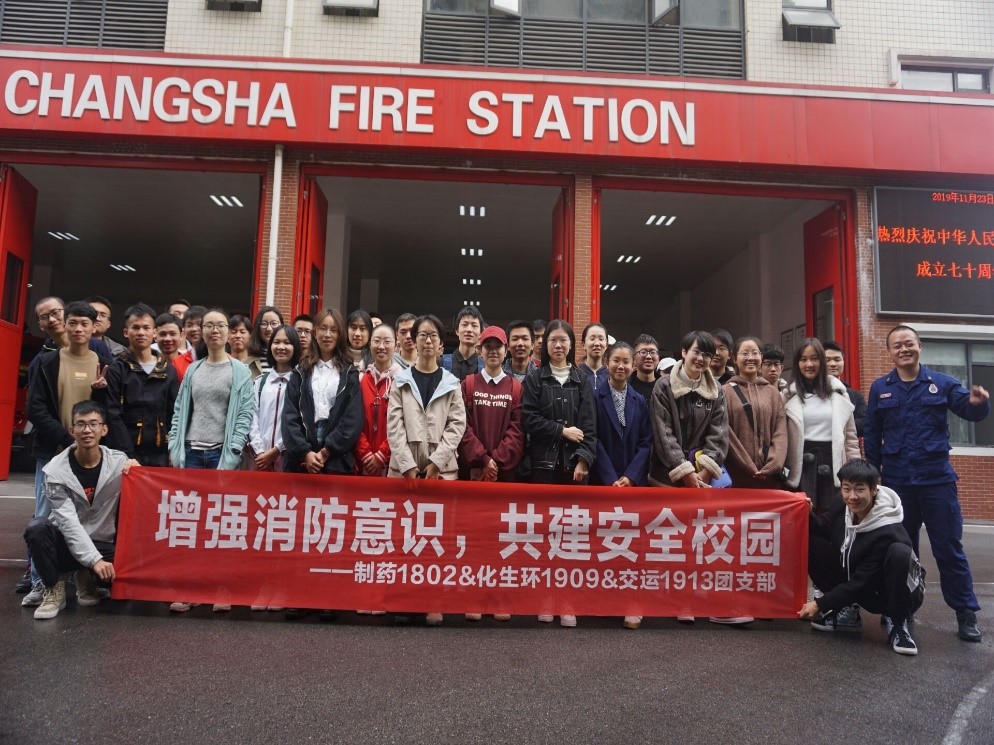 11月23日上午八点半,制药1802班、交运1913班、化生环1909班在长沙市公安消防支队天心区大队金盆岭中队开展以“增强消防知识,共建安全校园”为主题的团日活动。本次团日活动三个班全体同学参加,由该中队王班长为大家讲解消防知识。