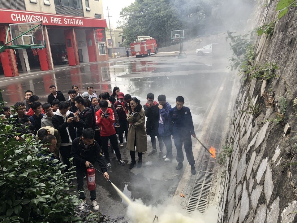 活动伊始,王班长展示了三种用于不同事故类型的消防车各自所配有的装备,并为大家介绍了各种装备的用途及其使用方法,让同学们对于消防车有了大致的了解。紧接着,惊心动魄的消防车高空灭火演示将活动推入高潮,从没有使用过灭火器的同学们在王班长的带领下依次使用干粉灭火器进行灭火,同学们基本掌握了灭火器的使用方法。