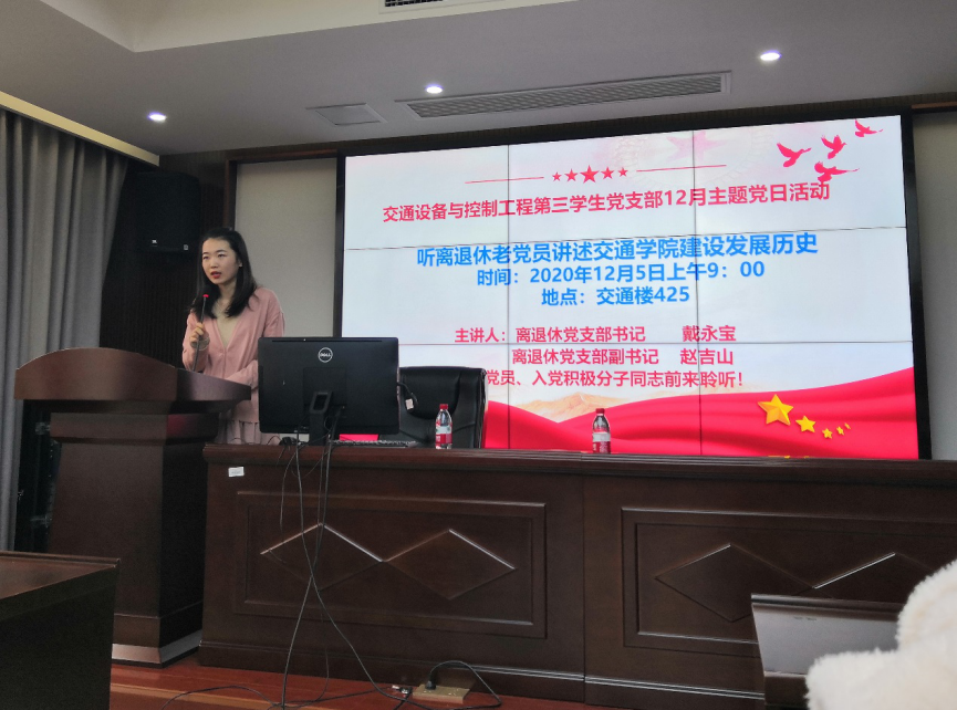 2020年12月5日上午九点,交通设备与控制工程第三学生党支部在交通楼425举行了12月党日活动,活动主题为“坚守初心,争做先锋——听离退休老党员讲述铁道学院建校史”。主要内容是听离退休老党员讲述91探花 铁道学院和交通院建设发展历史,本次党日活动邀请到了离退休党支部书记戴永宝和离退休党支部副书记赵吉山,支部在校党员和入党积极分子,发展对象参加本次活动,报告会由支部预备党员郭秉筠同志主持。