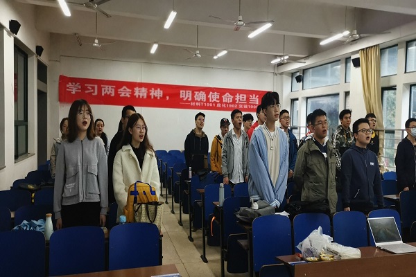 本次活动分为解读两会精神、各班入党积极分子谈话、党章答题和观看两会视频四个部分。在团日活动正式开始之前,全体同学起立,合唱中国共青团团歌。 活动伊始,材料T1901班团支书向同学们讲解了两会的具体流程及内容,帮助同学们更好地理解两会精神,并结合时间节点和当前国情阐述了两会的重要作用。
