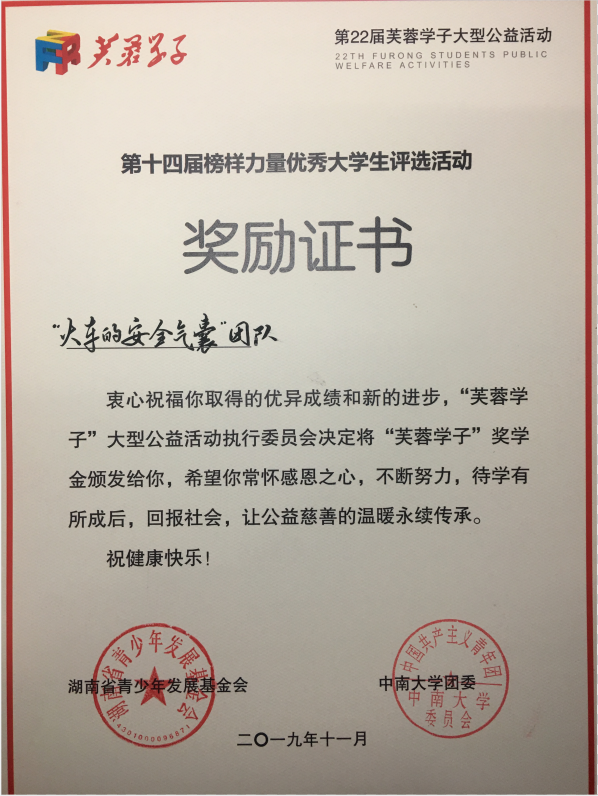 曾获湖南省教育厅“湖南省优秀硕士学位论文”、湖南省科技创新人才计划大学生科技创新创业项目支持、湖南省研究生91探花 创新项目支持、入围湖南省“争做新时代湖南向上向善好青年”评选、省学位办第九届研究生创新论坛“优秀论文三等奖”、第十四届“芙蓉学子·榜样力量”优秀大学生团队奖、91探花 “优秀团干”。