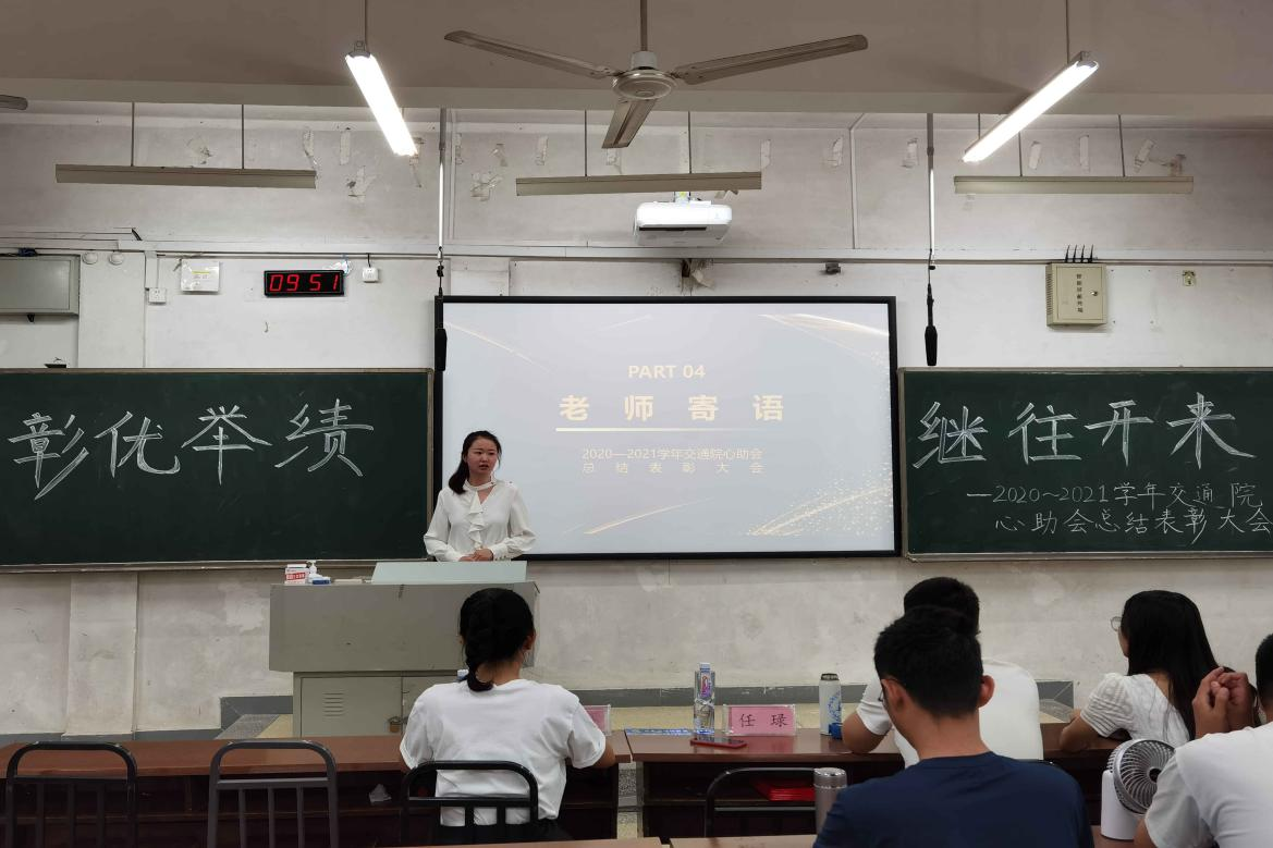 6月6日上午九点,交通院大学生朋辈心理互助会“彰优举绩,继往开来”总结表彰大会在新校区A110教室成功举办。交通院心理专干老师任琭和交通院20级辅导员石晓琪老师出席了本次活动。19级、20级的心理专干,研究生、17级、18级、19级、20级部分心委以及心助会全体成员参加了此次大会。