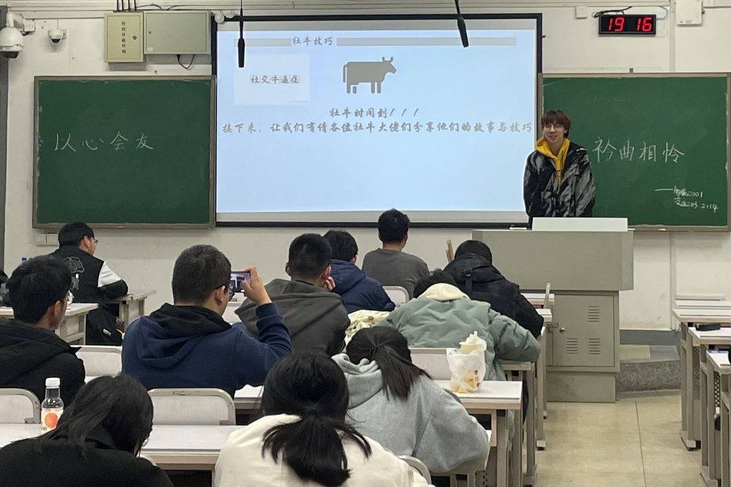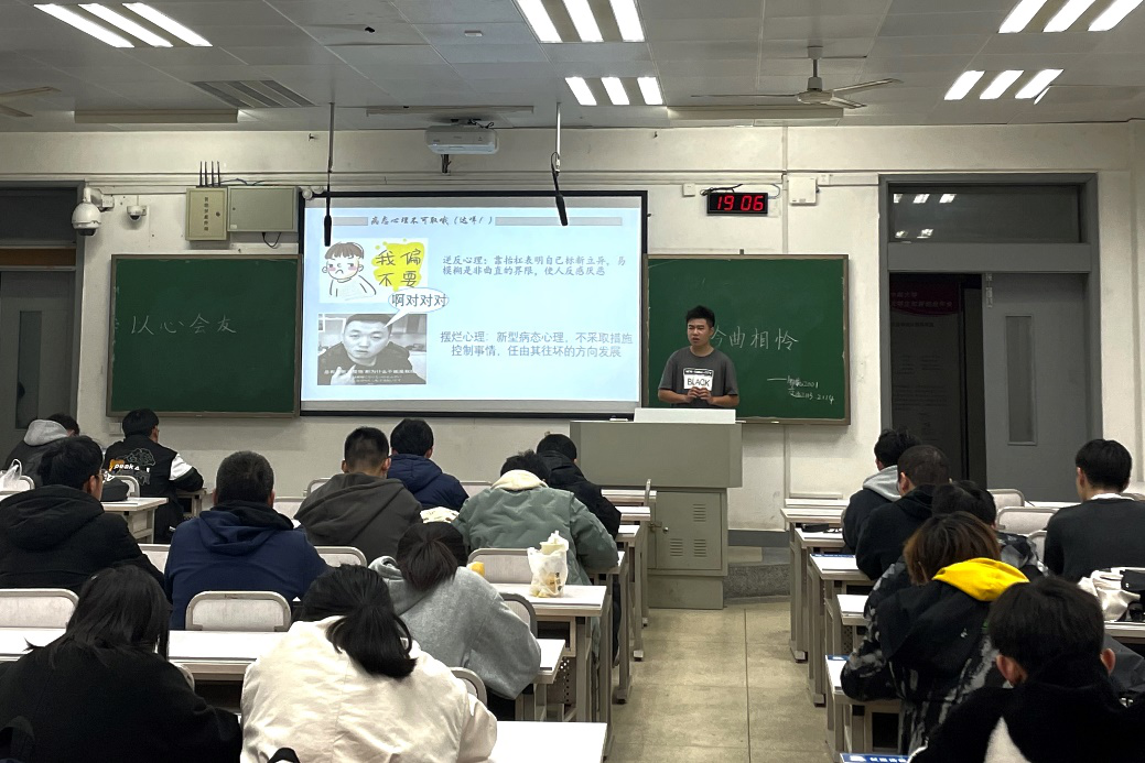 活动伊始,霍钰嘉向同学们介绍了当下大学生常见的病态心理,如逆反心理、摆烂心理等,并提出了自己的观点及解决办法。他建议同学们要敢于面对困难,学会向同学们和辅导员求助,拒绝摆烂躺平等消极心理态度,积极对待大学生活的每一天。