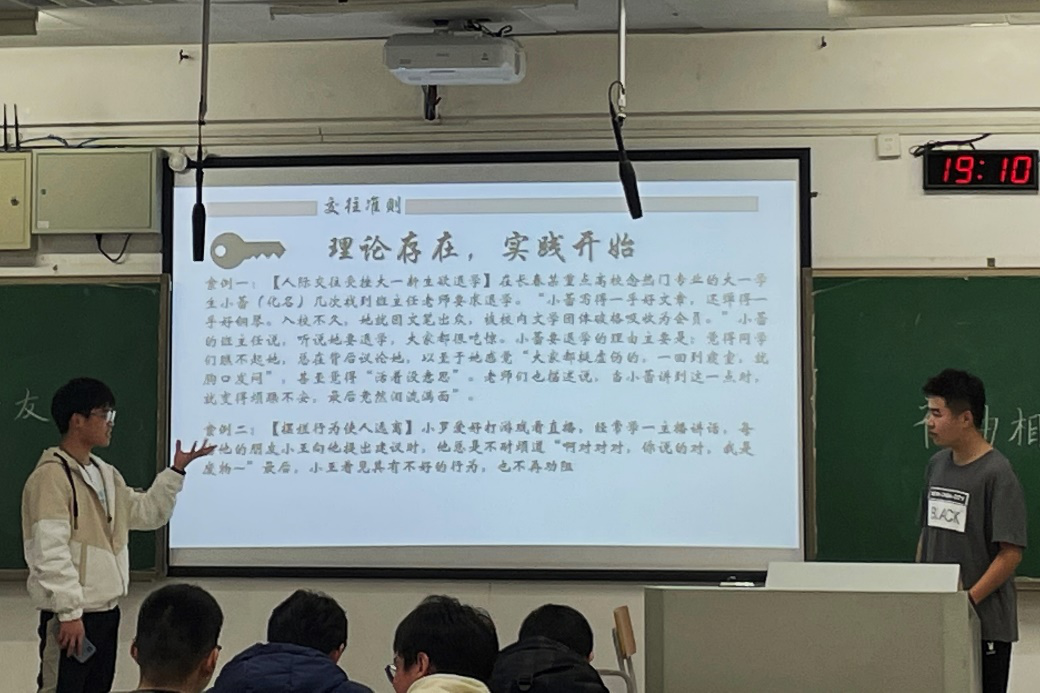 接着,各班同学代表上台分享自己的社交经历。各位代表真实地展现了大学生在面临社交问题和心理问题时的无助与迷茫,并且向大家展现了自己对每种病态心理的看法。