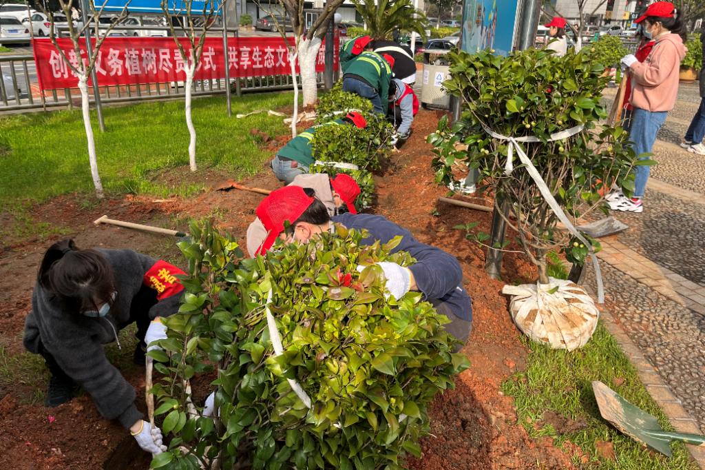 活动伊始,同志们依次签到,头戴志愿者服务帽、身穿红马甲、佩戴红袖章,整装待发。在绿化工作人员的带领下,同志们来到植树区域,戴上白手套,两三人一组。在听取了植树的技术要领后,同志们扛起锄头,挥起铁锹,分工协作,或扶树正苗,或铲土定植,或踩土压实,配合默契、热情高涨。最终,22名同志共栽种15棵树苗,为建设“绿水青山”贡献出了自己的一份力量。