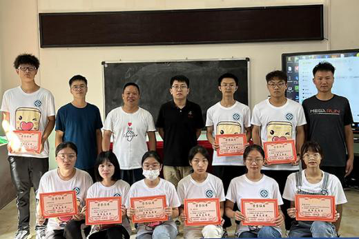 讲话结束,由与会嘉宾为支教队伍队员颁发优秀志愿者证书,证书加盖香花镇中心小学公章、香花镇人民政府公章、临武县共青团委公章。嘉宾与支教队伍合影留念。