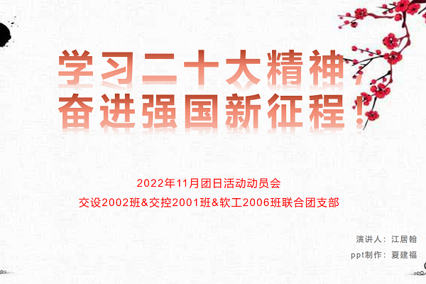 11月10日21:00,软件工程2006班、交通设备与控制工程2002班、轨道交通信号与控制2001班团支部联合举办“学习二十大精神,奋进强国新征程”主题团日活动。此次活动采取线上线下相结合的方式开展,各支部团员踊跃参加。