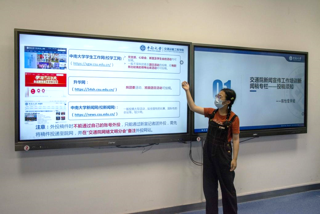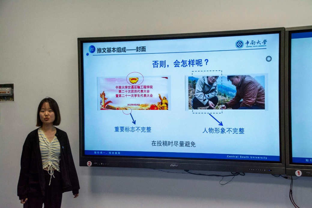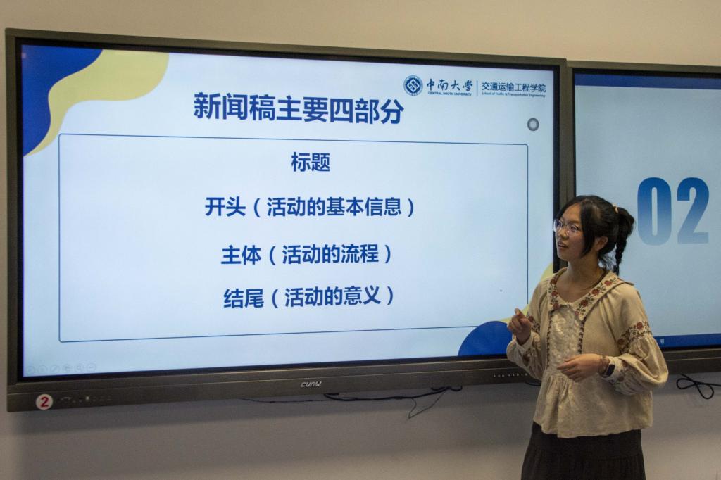 交流会伊始,新宣记者团部员陈怡莹就新闻稿的投稿须知进行讲解。她主要从稿件投递网站介绍、稿件投递流程及要求、稿酬及其发放三个方面展开,为交通院的新闻工作者们梳理宣传渠道,明确投稿要求。