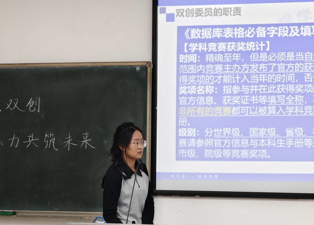 其次,针对同学们关注的学校、学院重点建设项目,创新创业中心李佳音、蒋琰对重点学科竞赛进行了详细讲解,并向各位双创委员说明了项目申报时的注意事项。