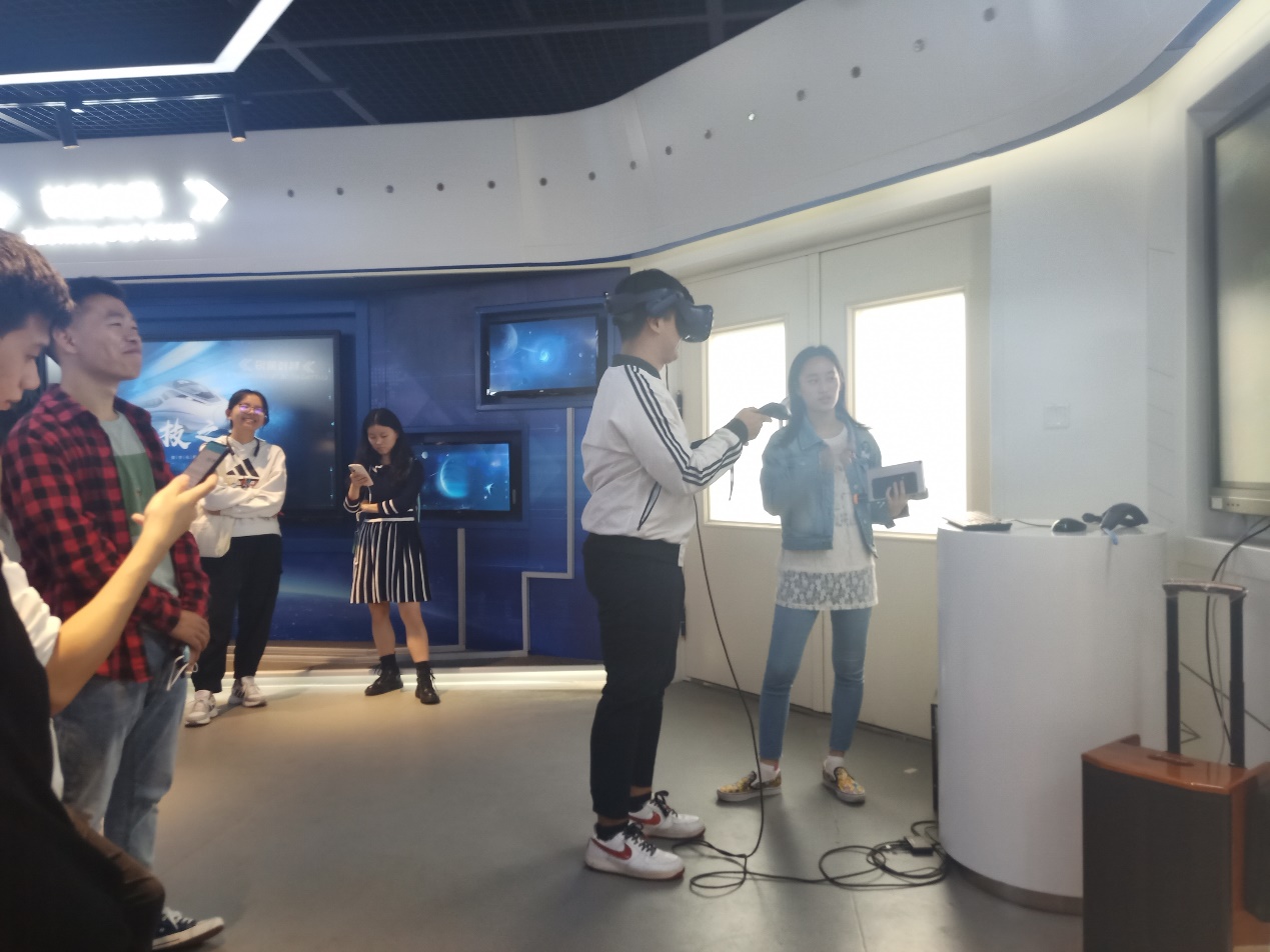 成果、超限重载铁路运输安全以及世界交通未来图景等内容有了更加具体和系统的理解。这对于之后在实验室的参观起了很好的铺垫作用。随后,在志愿者的协助下,同学们分别通过VR体验了高铁站台、车厢、司机室等环境。