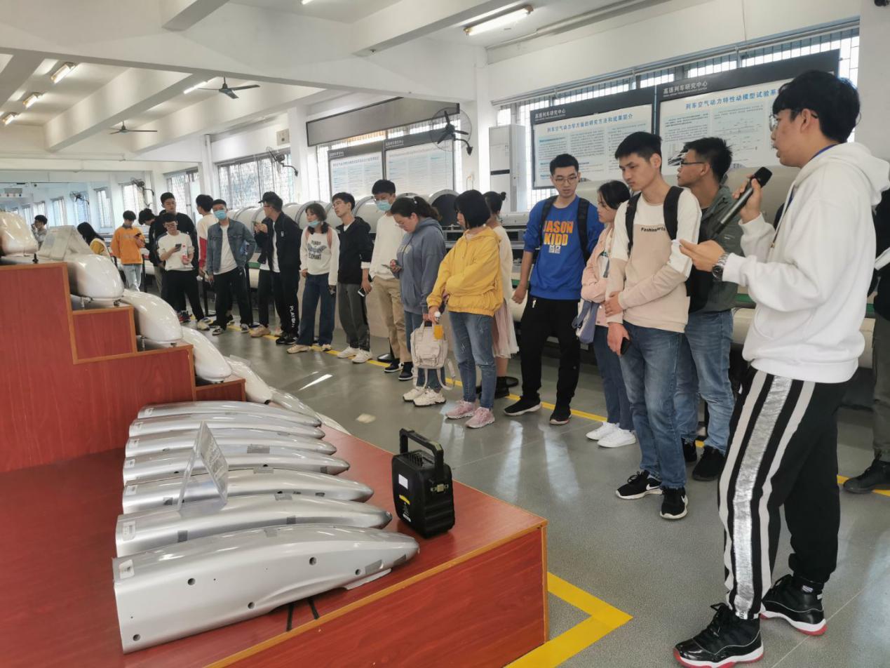 最后在列车动模型实验室,志愿者从模型实验台的原理、实验室陈列的列车模型两个方面为同学们进行讲解。动模型试验是模拟列车与列车、空气、地面、隧道之间的相对运动,研究高速列车的气动特性,世界上共有4个这样的试验台,这里占了2台,最高实验速度可达600km/h。另外一侧陈列的中国铁路各个时代的车头外形设计。分为4个展区:城际/磁浮/地铁模型、高速列车模型(复兴号等)、早期自主创新成果(中华之星等)、流动控制和仿生学成果(新发展方向)。