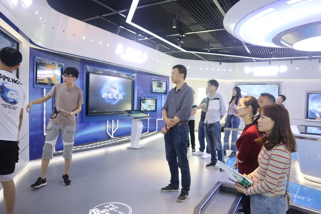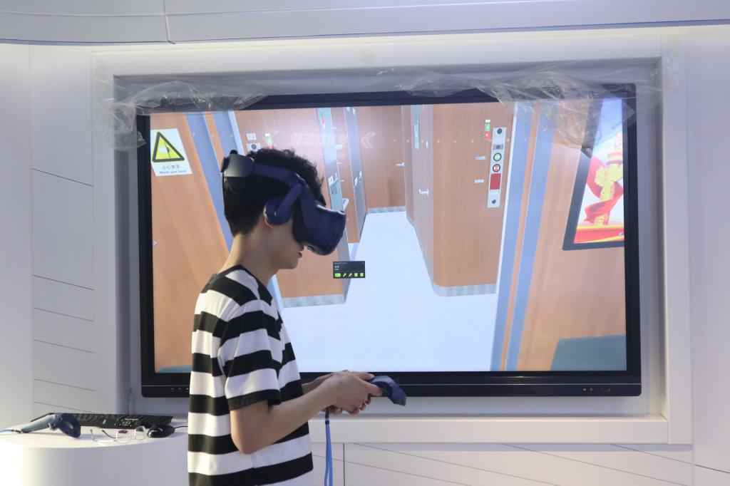 先进轨道交通科普馆内,参观者们可以通过利用多点触摸展示系统、VR互动体验、飞屏、触摸关联屏等现代化技术,系统性呈现了轨道交通发展历史、系统科技知识、最新前沿成果以及未来发展图景,犹如登上列车,循着岁月车轮,徜徉科技之旅,探索列车奥秘,感受轨道交通技术革新,见证中国铁路发展速度。馆内有高天宇、王攀、翁铭骏等同学带领各位参观者参观、帮助体验VR人机互动平台等。